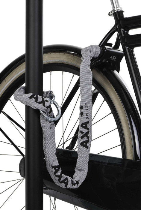 Låset har ett hål på sidan i vilken man kan låsa fast en kabel eller kedja som har en Axa-plug.