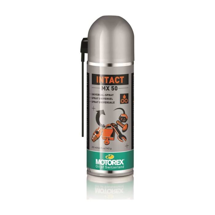 Motorex intact MX50 är ett universalsmörjmedel och rostskyddande spray. Sprayen lämnar en mycket effektiv skyddsfilm. Det är vattenavvisande, har utmärkta krypande egenskaper och förhindrar korrosion och gnisslande ljud.